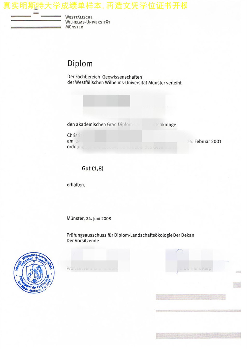 定做德国大学文凭: University of Muenster毕业证成绩单、德国学历证书、明斯特大学文凭。